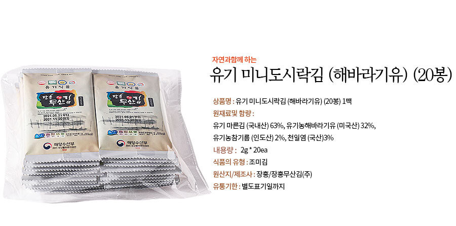 장흥무산김 유기 미니도시락김 (20봉) 1팩