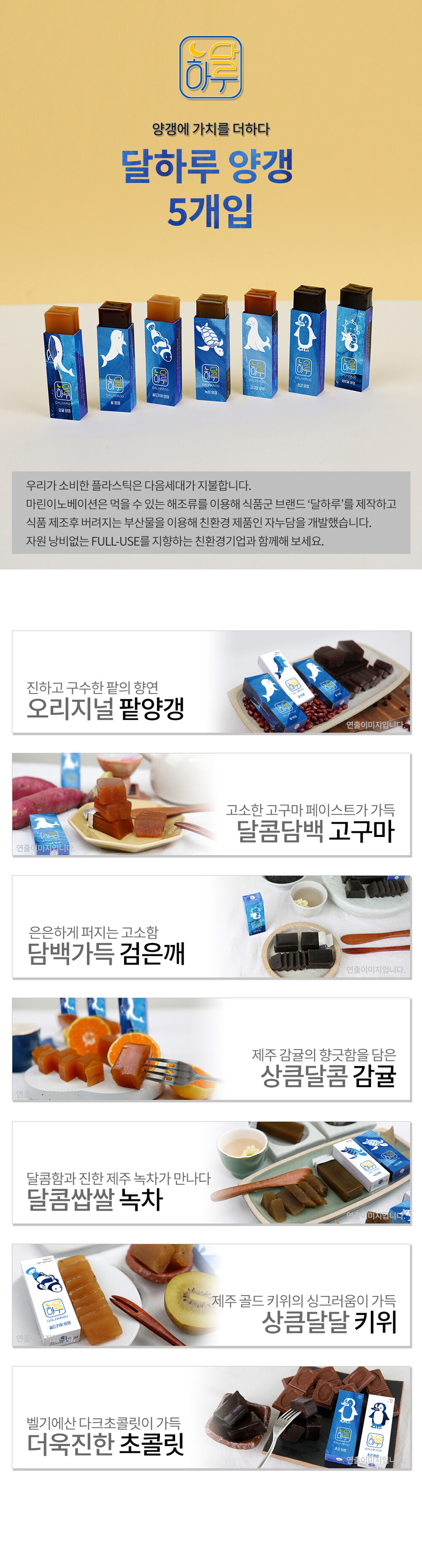 팥, 녹차, 검은깨, 골드키위, 감귤 총 다섯 가지의 다양한 맛과 영양을 담아 입맛대로 골라 먹을 수 있어 쫄깃하고 부드러운 맛의 다양한 양갱을 즐길 수 있습니다.